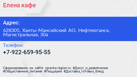 Елена, кафе по адресу 628305, Ханты-Мансийский АО, Нефтеюганск, Магистральная, 30а в дальнейшем Организация, размещена в следующих категориях: