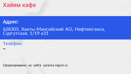 Хайям, кафе по адресу 628305, Ханты-Мансийский АО, Нефтеюганск, Сургутская, 1/19 к31 в дальнейшем Организация, размещена в следующих категориях: