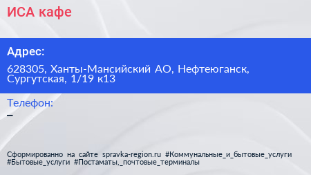 ИСА, кафе по адресу 628305, Ханты-Мансийский АО, Нефтеюганск, Сургутская, 1/19 к13 в дальнейшем Организация, размещена в следующих категориях: