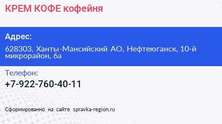 КРЕМ КОФЕ, кофейня по адресу 628303, Ханты-Мансийский АО, Нефтеюганск, 10-й микрорайон, 6а в дальнейшем Организация, размещена в следующих категориях: