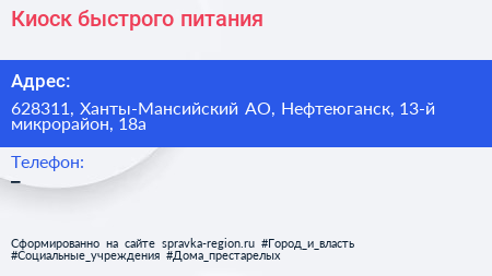 Киоск быстрого питания по адресу 628311, Ханты-Мансийский АО, Нефтеюганск, 13-й микрорайон, 18а в дальнейшем Организация, размещена в следующих категориях: