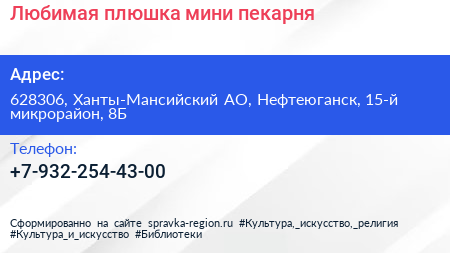 Любимая плюшка, мини-пекарня по адресу 628306, Ханты-Мансийский АО, Нефтеюганск, 15-й микрорайон, 8Б в дальнейшем Организация, размещена в следующих категориях: