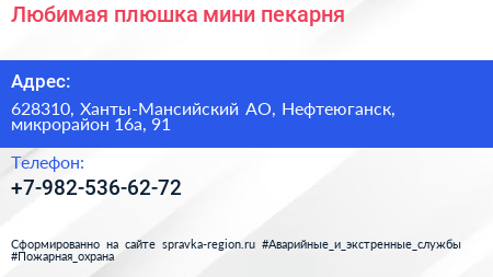 Любимая плюшка, мини-пекарня по адресу 628310, Ханты-Мансийский АО, Нефтеюганск, микрорайон 16а, 91 в дальнейшем Организация, размещена в следующих категориях: