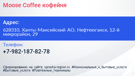 Moose Coffee, кофейня по адресу 628310, Ханты-Мансийский АО, Нефтеюганск, 12-й микрорайон, 29 в дальнейшем Организация, размещена в следующих категориях: