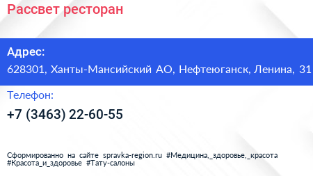Рассвет, ресторан по адресу 628301, Ханты-Мансийский АО, Нефтеюганск, Ленина, 31 в дальнейшем Организация, размещена в следующих категориях:
