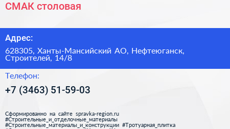 СМАК, столовая по адресу 628305, Ханты-Мансийский АО, Нефтеюганск, Строителей, 14/8 в дальнейшем Организация, размещена в следующих категориях: