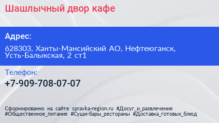 Шашлычный двор, кафе по адресу 628303, Ханты-Мансийский АО, Нефтеюганск, Усть-Балыкская, 2 ст1 в дальнейшем Организация, размещена в следующих категориях: