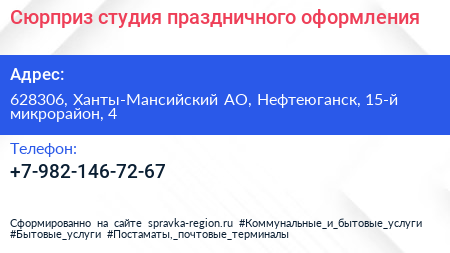 Сюрприз, студия праздничного оформления по адресу 628306, Ханты-Мансийский АО, Нефтеюганск, 15-й микрорайон, 4 в дальнейшем Организация, размещена в следующих категориях: