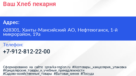 Ваш Хлеб, пекарня по адресу 628301, Ханты-Мансийский АО, Нефтеюганск, 1-й микрорайон, 19а в дальнейшем Организация, размещена в следующих категориях: