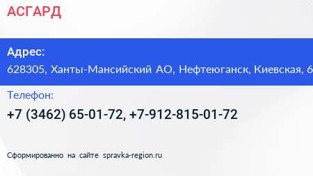 АСГАРД по адресу 628305, Ханты-Мансийский АО, Нефтеюганск, Киевская, 6 в дальнейшем Организация, размещена в следующих категориях: