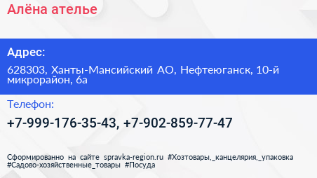 Алёна, ателье по адресу 628303, Ханты-Мансийский АО, Нефтеюганск, 10-й микрорайон, 6а в дальнейшем Организация, размещена в следующих категориях: