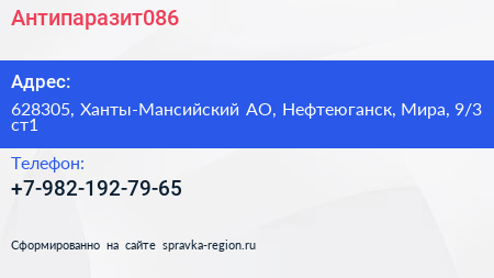 Антипаразит086 по адресу 628305, Ханты-Мансийский АО, Нефтеюганск, Мира, 9/3 ст1 в дальнейшем Организация, размещена в следующих категориях: