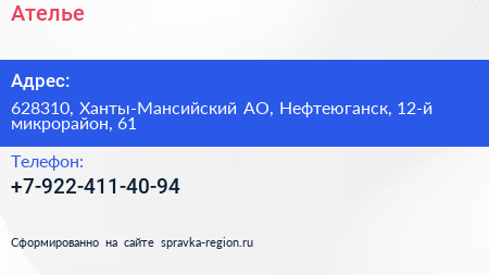 Ателье по адресу 628310, Ханты-Мансийский АО, Нефтеюганск, 12-й микрорайон, 61 в дальнейшем Организация, размещена в следующих категориях: