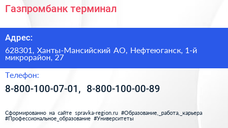 Газпромбанк, терминал по адресу 628301, Ханты-Мансийский АО, Нефтеюганск, 1-й микрорайон, 27 в дальнейшем Организация, размещена в следующих категориях: