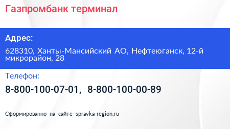 Газпромбанк, терминал по адресу 628310, Ханты-Мансийский АО, Нефтеюганск, 12-й микрорайон, 28 в дальнейшем Организация, размещена в следующих категориях: