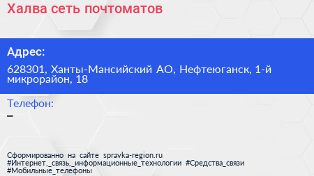 Халва, сеть почтоматов по адресу 628301, Ханты-Мансийский АО, Нефтеюганск, 1-й микрорайон, 18 в дальнейшем Организация, размещена в следующих категориях: