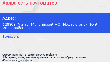Халва, сеть почтоматов по адресу 628303, Ханты-Мансийский АО, Нефтеюганск, 10-й микрорайон, 4а в дальнейшем Организация, размещена в следующих категориях: