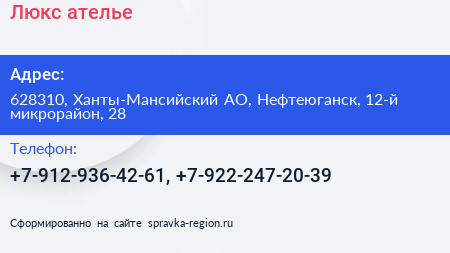 Люкс, ателье по адресу 628310, Ханты-Мансийский АО, Нефтеюганск, 12-й микрорайон, 28 в дальнейшем Организация, размещена в следующих категориях: