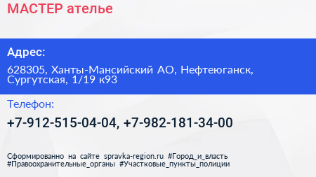 МАСТЕР, ателье по адресу 628305, Ханты-Мансийский АО, Нефтеюганск, Сургутская, 1/19 к93 в дальнейшем Организация, размещена в следующих категориях: