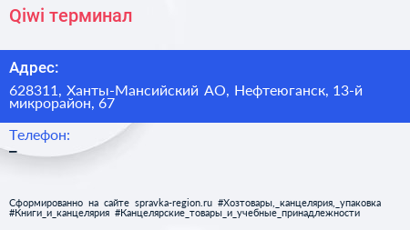 Qiwi, терминал по адресу 628311, Ханты-Мансийский АО, Нефтеюганск, 13-й микрорайон, 67 в дальнейшем Организация, размещена в следующих категориях: