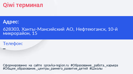 Qiwi, терминал по адресу 628303, Ханты-Мансийский АО, Нефтеюганск, 10-й микрорайон, 15 в дальнейшем Организация, размещена в следующих категориях: