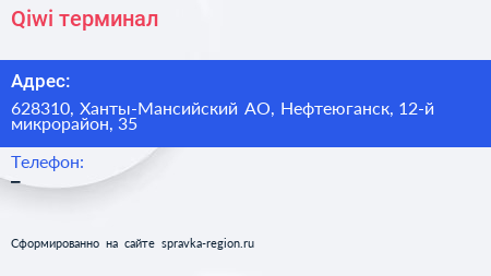 Qiwi, терминал по адресу 628310, Ханты-Мансийский АО, Нефтеюганск, 12-й микрорайон, 35 в дальнейшем Организация, размещена в следующих категориях: