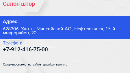 Салон штор по адресу 628306, Ханты-Мансийский АО, Нефтеюганск, 15-й микрорайон, 20 в дальнейшем Организация, размещена в следующих категориях: