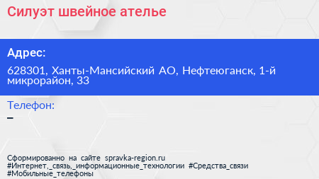 Силуэт, швейное ателье по адресу 628301, Ханты-Мансийский АО, Нефтеюганск, 1-й микрорайон, 33 в дальнейшем Организация, размещена в следующих категориях: