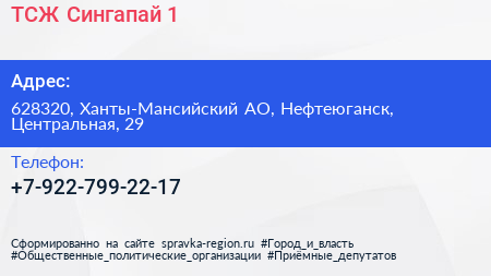 ТСЖ Сингапай 1 по адресу 628320, Ханты-Мансийский АО, Нефтеюганск, Центральная, 29 в дальнейшем Организация, размещена в следующих категориях: