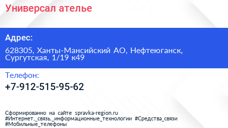Универсал, ателье по адресу 628305, Ханты-Мансийский АО, Нефтеюганск, Сургутская, 1/19 к49 в дальнейшем Организация, размещена в следующих категориях: