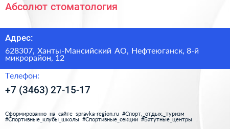 Абсолют, стоматология по адресу 628307, Ханты-Мансийский АО, Нефтеюганск, 8-й микрорайон, 12 в дальнейшем Организация, размещена в следующих категориях: