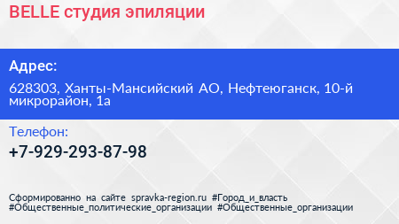 BELLE, студия эпиляции по адресу 628303, Ханты-Мансийский АО, Нефтеюганск, 10-й микрорайон, 1а в дальнейшем Организация, размещена в следующих категориях: