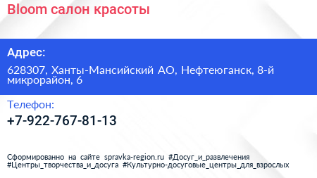 Bloom, салон красоты по адресу 628307, Ханты-Мансийский АО, Нефтеюганск, 8-й микрорайон, 6 в дальнейшем Организация, размещена в следующих категориях: