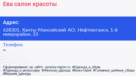 Ева, салон красоты по адресу 628301, Ханты-Мансийский АО, Нефтеюганск, 1-й микрорайон, 33 в дальнейшем Организация, размещена в следующих категориях: