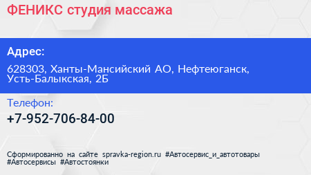 ФЕНИКС, студия массажа по адресу 628303, Ханты-Мансийский АО, Нефтеюганск, Усть-Балыкская, 2Б в дальнейшем Организация, размещена в следующих категориях: