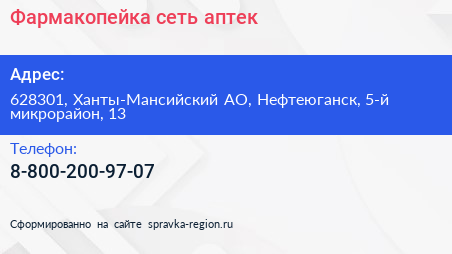 Фармакопейка, сеть аптек по адресу 628301, Ханты-Мансийский АО, Нефтеюганск, 5-й микрорайон, 13 в дальнейшем Организация, размещена в следующих категориях: