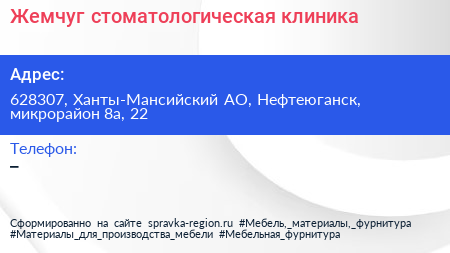 Жемчуг, стоматологическая клиника по адресу 628307, Ханты-Мансийский АО, Нефтеюганск, микрорайон 8а, 22 в дальнейшем Организация, размещена в следующих категориях:
