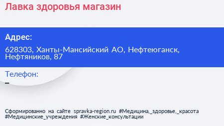 Лавка здоровья, магазин по адресу 628303, Ханты-Мансийский АО, Нефтеюганск, Нефтяников, 87 в дальнейшем Организация, размещена в следующих категориях: