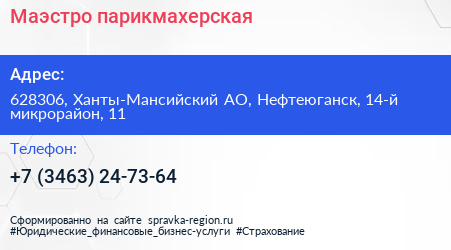 Маэстро, парикмахерская по адресу 628306, Ханты-Мансийский АО, Нефтеюганск, 14-й микрорайон, 11 в дальнейшем Организация, размещена в следующих категориях: