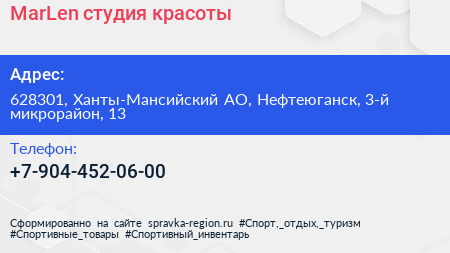 MarLen, студия красоты по адресу 628301, Ханты-Мансийский АО, Нефтеюганск, 3-й микрорайон, 13 в дальнейшем Организация, размещена в следующих категориях: