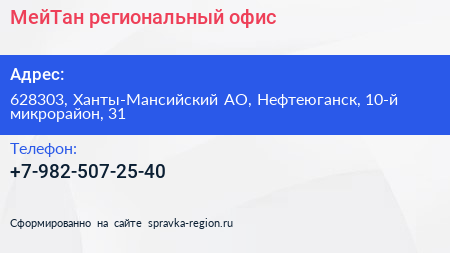 МейТан, региональный офис по адресу 628303, Ханты-Мансийский АО, Нефтеюганск, 10-й микрорайон, 31 в дальнейшем Организация, размещена в следующих категориях: