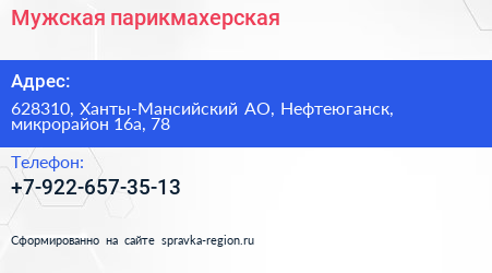Мужская парикмахерская по адресу 628310, Ханты-Мансийский АО, Нефтеюганск, микрорайон 16а, 78 в дальнейшем Организация, размещена в следующих категориях: