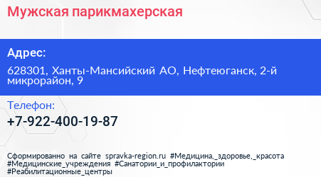 Мужская парикмахерская по адресу 628301, Ханты-Мансийский АО, Нефтеюганск, 2-й микрорайон, 9 в дальнейшем Организация, размещена в следующих категориях: