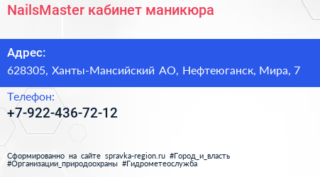 NailsMaster, кабинет маникюра по адресу 628305, Ханты-Мансийский АО, Нефтеюганск, Мира, 7 в дальнейшем Организация, размещена в следующих категориях: