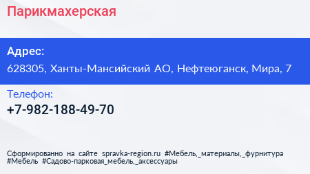 Парикмахерская по адресу 628305, Ханты-Мансийский АО, Нефтеюганск, Мира, 7 в дальнейшем Организация, размещена в следующих категориях: