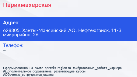 Парикмахерская по адресу 628305, Ханты-Мансийский АО, Нефтеюганск, 11-й микрорайон, 26 в дальнейшем Организация, размещена в следующих категориях: