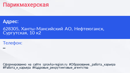Парикмахерская по адресу 628305, Ханты-Мансийский АО, Нефтеюганск, Сургутская, 10 к2 в дальнейшем Организация, размещена в следующих категориях: