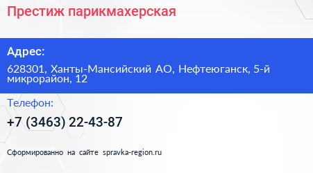 Престиж, парикмахерская по адресу 628301, Ханты-Мансийский АО, Нефтеюганск, 5-й микрорайон, 12 в дальнейшем Организация, размещена в следующих категориях: