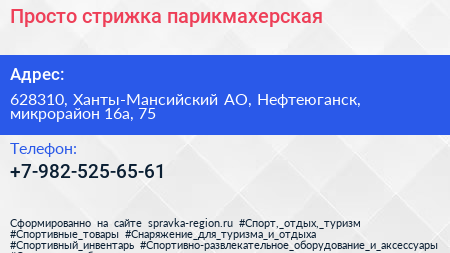 Просто стрижка, парикмахерская по адресу 628310, Ханты-Мансийский АО, Нефтеюганск, микрорайон 16а, 75 в дальнейшем Организация, размещена в следующих категориях:
