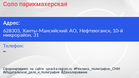 Соло, парикмахерская по адресу 628303, Ханты-Мансийский АО, Нефтеюганск, 10-й микрорайон, 31 в дальнейшем Организация, размещена в следующих категориях: